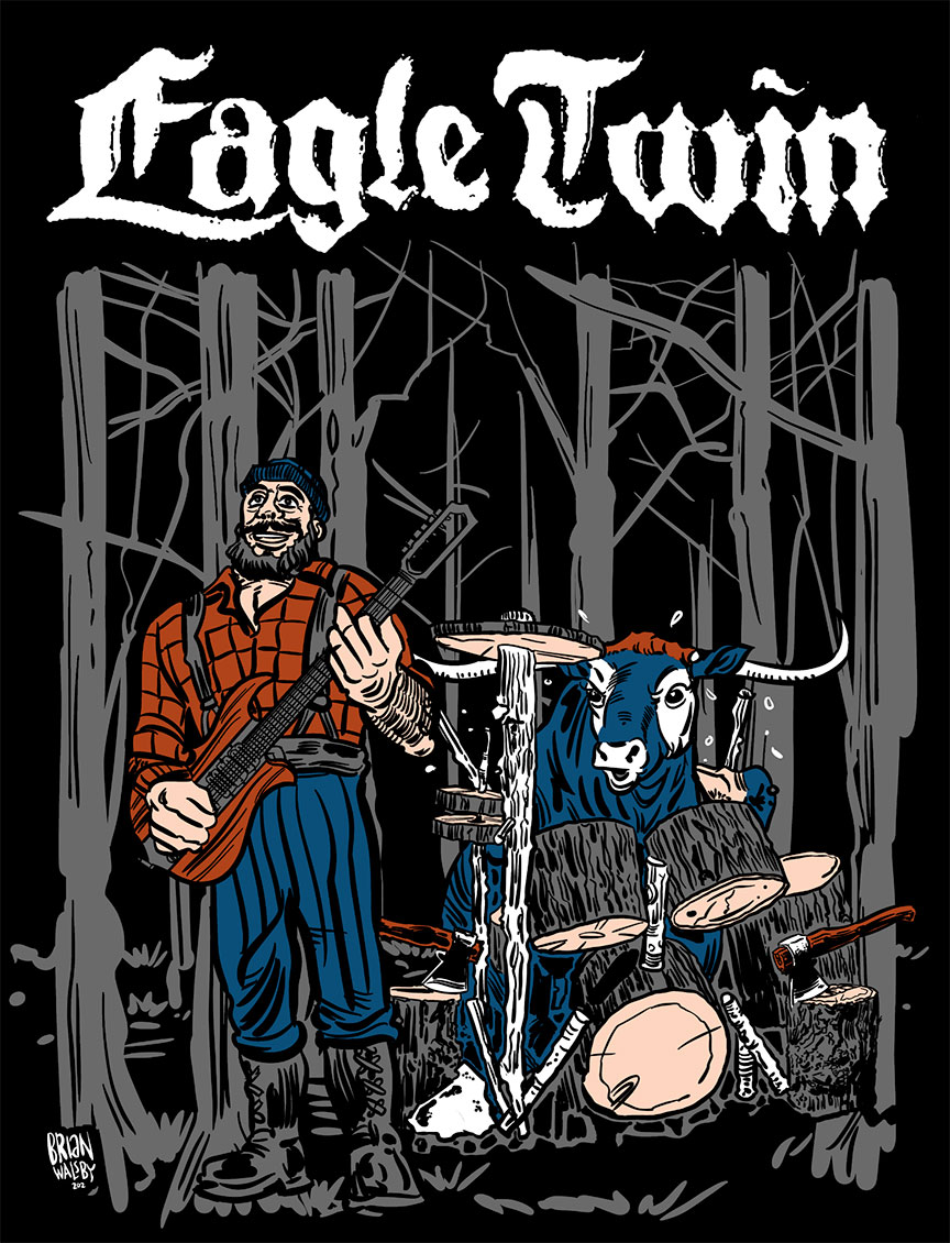 Flash forward decades and I see he is playing in a new duo with drummer Tyler Smith called Eagle Twin, a duo. Only they are not a new band at all. You can’t know about everything. Right away I was pummeled by their sound, which was very reminiscent of nature, berries, timber, oxes, splitting wood for the fire, you know that sort of thing. He played what looked like a baritone guitar or a six string bass. It is some crazy shit. I never knew Gentry. But through the magic of the internet, now I do. After I asked a bunch of annoying questions, he agreed to the idea of me drawing a limited Bifocal Media t shirt for their fan base, and here it is! We hope you like it and I thank Gentry and Charles for making this a reality. Check out Eagle Twin and when you are done building that log cabin, get this shirt! Thanks! -Brian Walsby