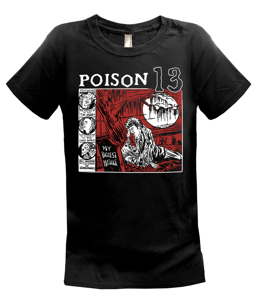 Poison 13 put out a second twelve inch e.p. and then? I dont know. I guess everyone moved on. Mike and Tim ended up on a new band, the excellent Lord High Fixers. I really dug Poison 13 and want to thank Tim for the green light to make a few of these shirts. I hope you all dig this spooky Poison 13 t shirt. Lastly, this shirt goes out to the memory of Mike, who is featured front and center on this design. Cheers! -Brian Walsby