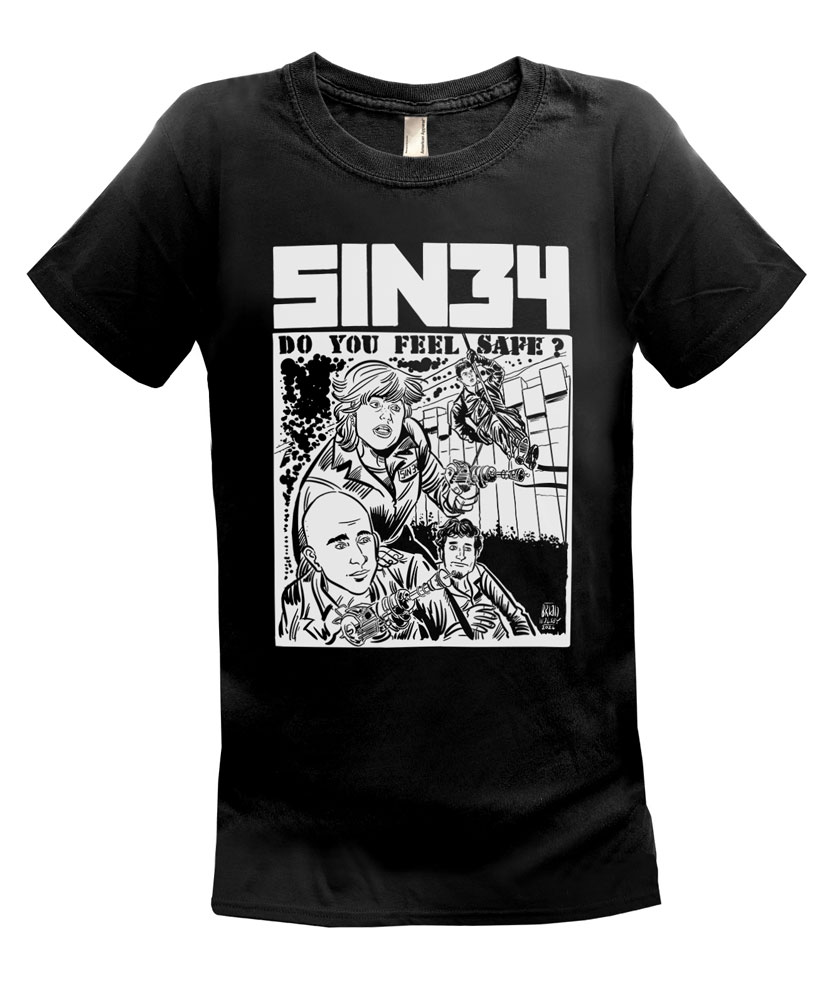 Sin 34 released a single and a album in their lifetime, material that I like to this very day, now matter how old I am! I would like to thank surviving members Dave Markey and Michael Glass for allowing myself and Charles the chance to make this shirt. Thanks and Cheers! -Brian Walsby