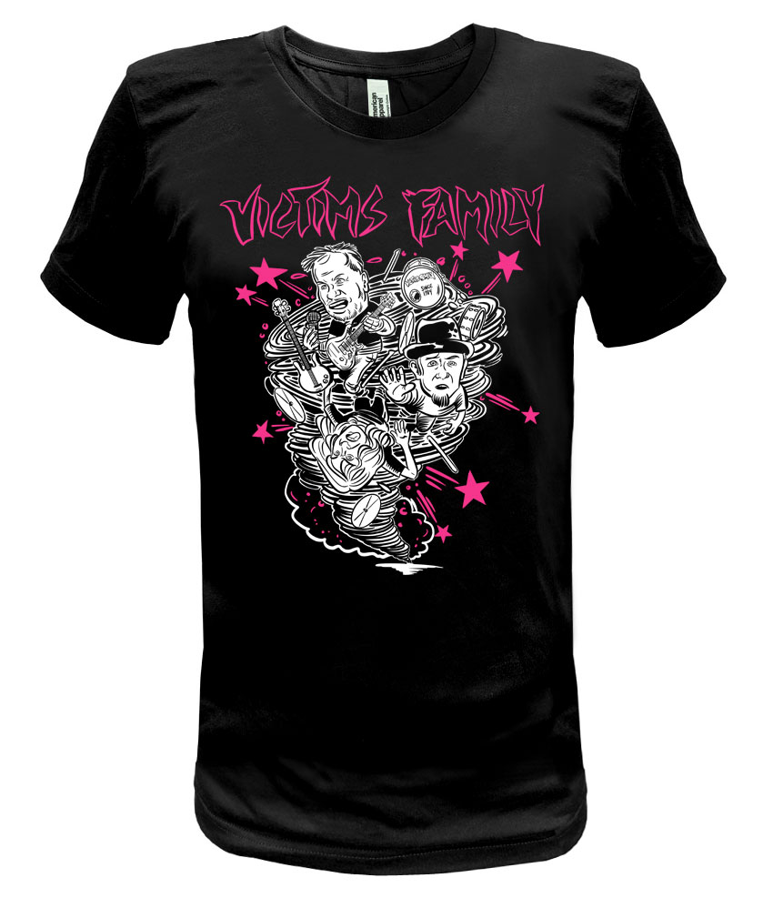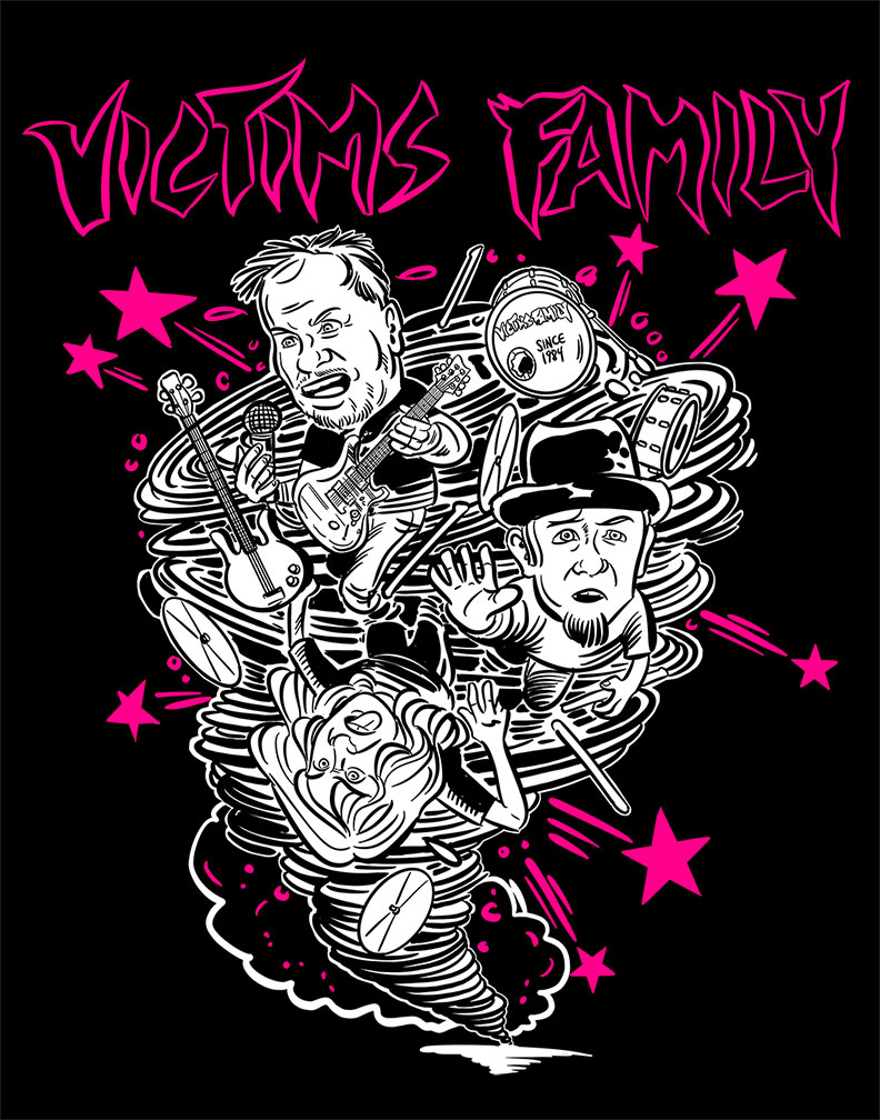 Over the years when I worked with the Melvins, I would run into bassist Larry Boothroyd at shows and he was always a super nice guy. I did some work for him over the years and that led to this design that features the Larry/Ralph/Tim on drums long-standing lineup. It was fun to draw and we all hope you enjoy this Victims Family t shirt. Thanks to the band and Charles are letting this happen. -Brian Walsby